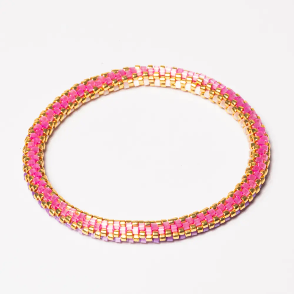 Pulseira Caminhos de Miçangas Rosa e Lilás com Madre Branco