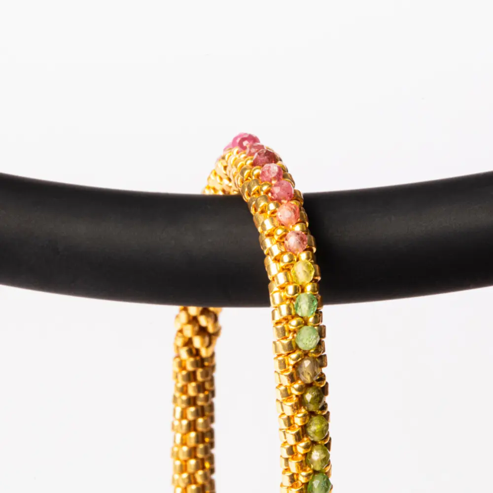 Cada peça é inspirada e desenvolvida para refletir uma verdadeira joia artesanal de miçangas com diversos materiais preciosos. Com pulseiras e colares que convivem harmoniosamente entre si, a coleção “Caminhos” convida você a trilhar seu próprio estilo, misturando cores e materiais em composições únicas e versáteis.